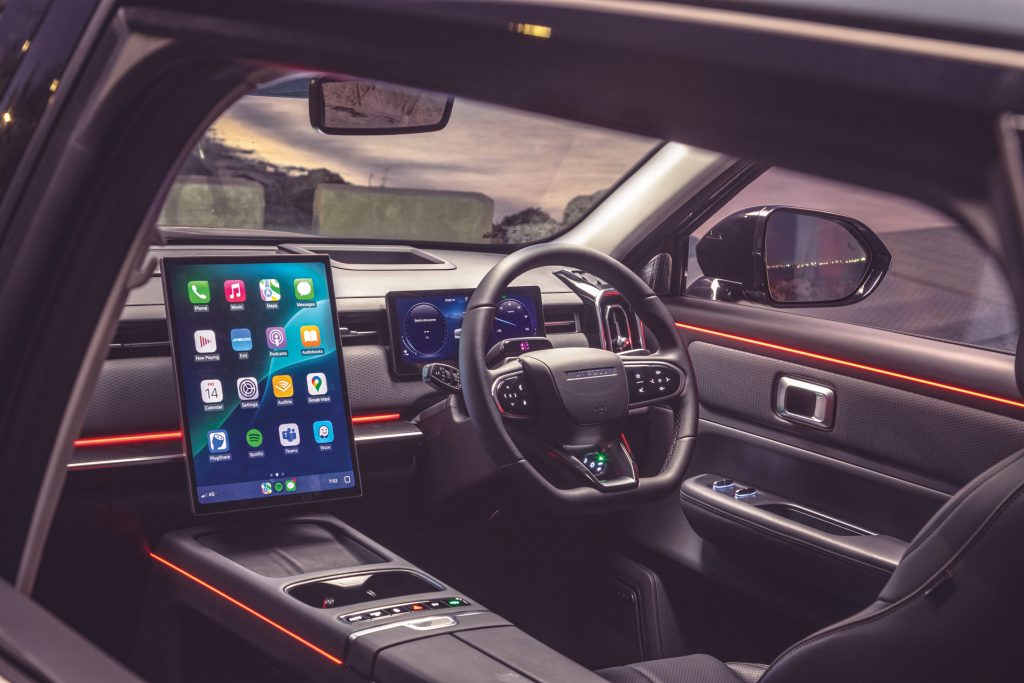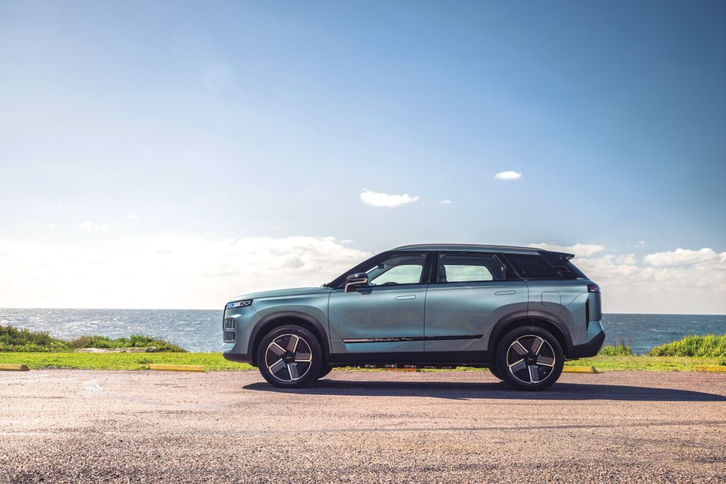 This is right sized for many. Big enough to fit three in the back – a completely flat floor helps – and with decent leg and headroom. Open the powered fifth door and there’s 340L of gear space, expanding to 1265L. That’s less than the other J7s have because of the underfloor battery pack.