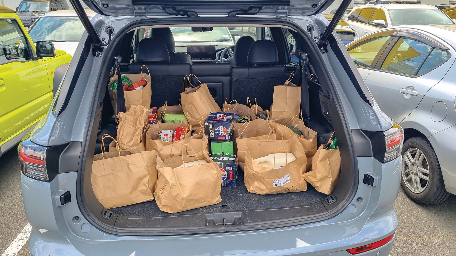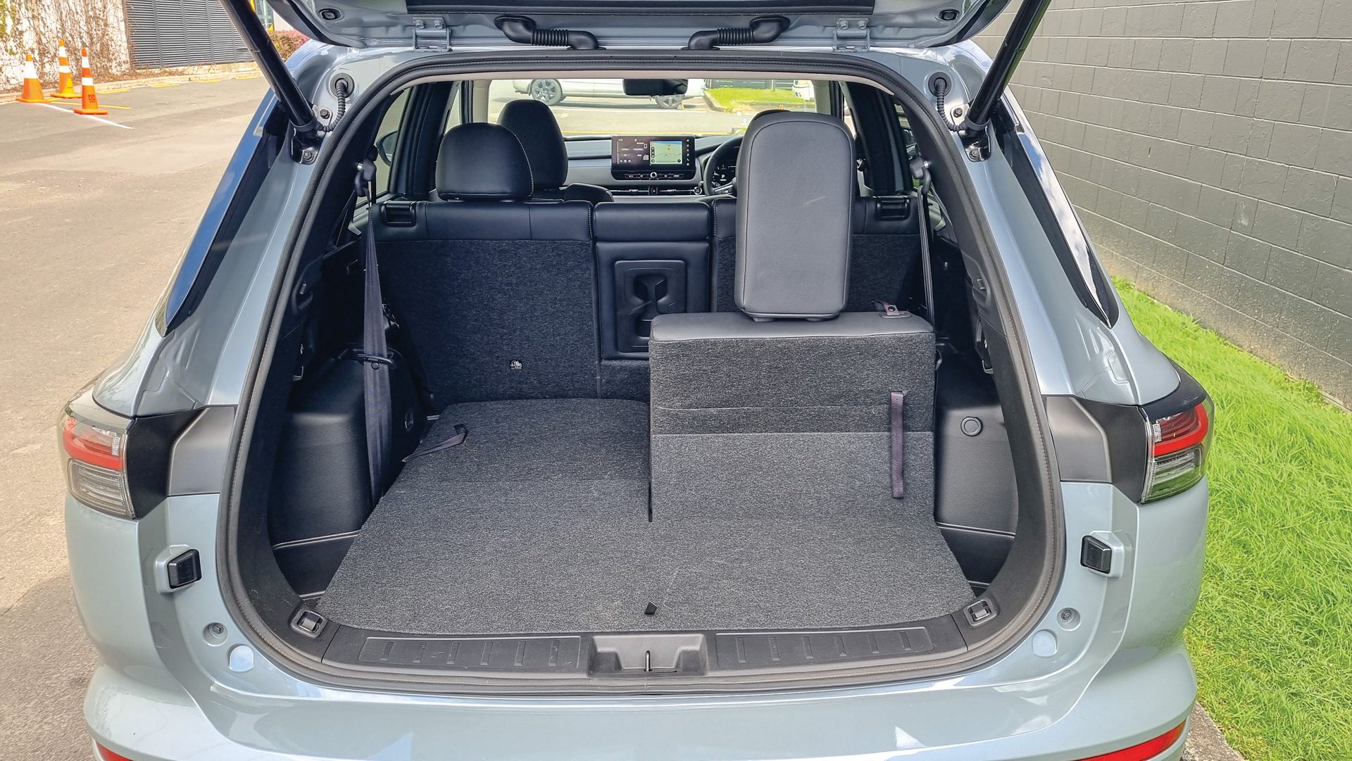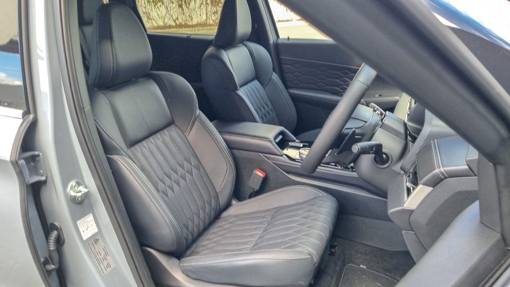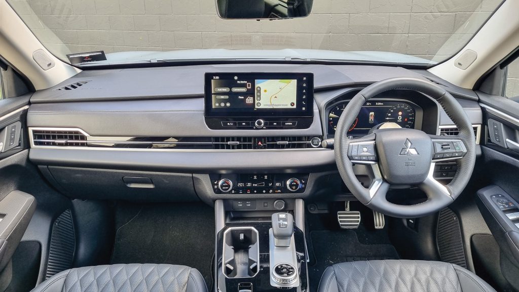Without any electrification in the driveline mix, the Outlander feels sluggish off the mark. The 2.5’s 244Nm of torque doesn’t chime in properly until 3600rpm, which is where it perks up. The VRX weighs in at 1721kg, and feels it too, even more so with six bods on board. Once up and cruising, the CVT will knock the revs back to 1200rpm around town to ease consumption, though it does need liberal encouragement to spur the horses along again.