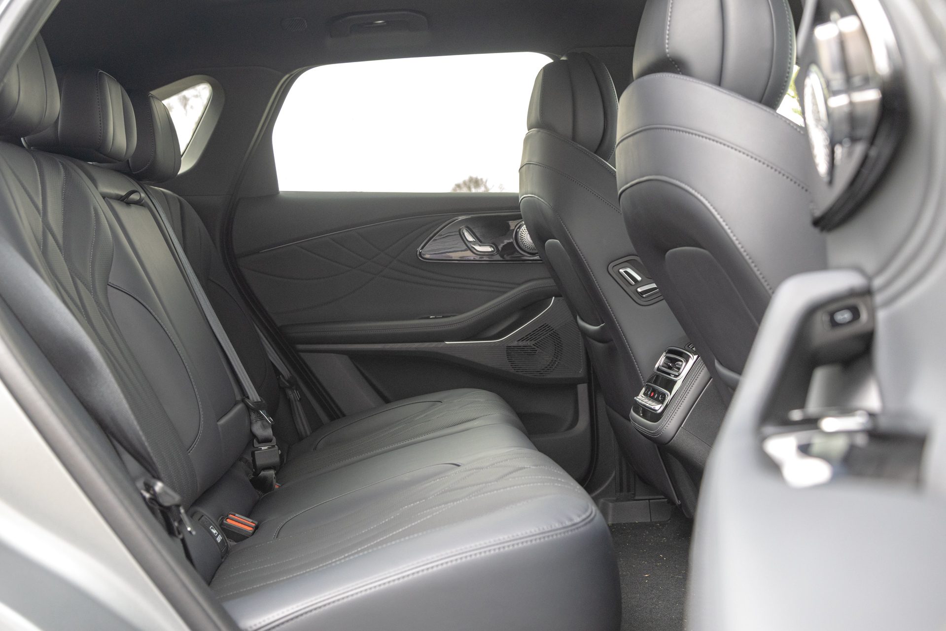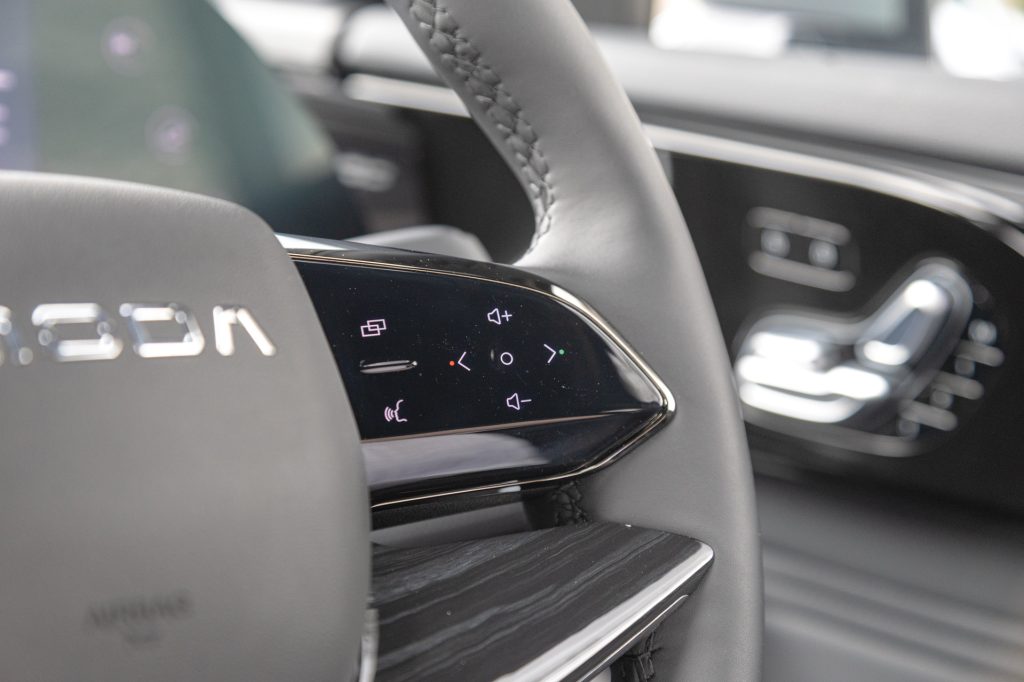 But it’s a fairly impressive looking machine. It had a lot of people giving it a second glance. That said, some of the styling features we’d seen before, like that Lexus-aping C-pillar. It’s a big machine too, nearly 4.8m long. Step into the rear, and people will find enough room, the flat floor helping with legroom. Folk back there get seat heaters and ventilation too, a separate zone of air conditioning and some USB ports. Take a look at some of the details, and there’s a clear Merc influence. Well, it’s more of a copy really, from the stitching pattern on the seat and door trims, the speaker vents. Everything’s pretty much a replica. Oh well, electrically recline the back rest and relax; the cabin is nicely made, and it’s comfortable back there.