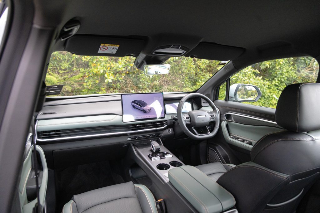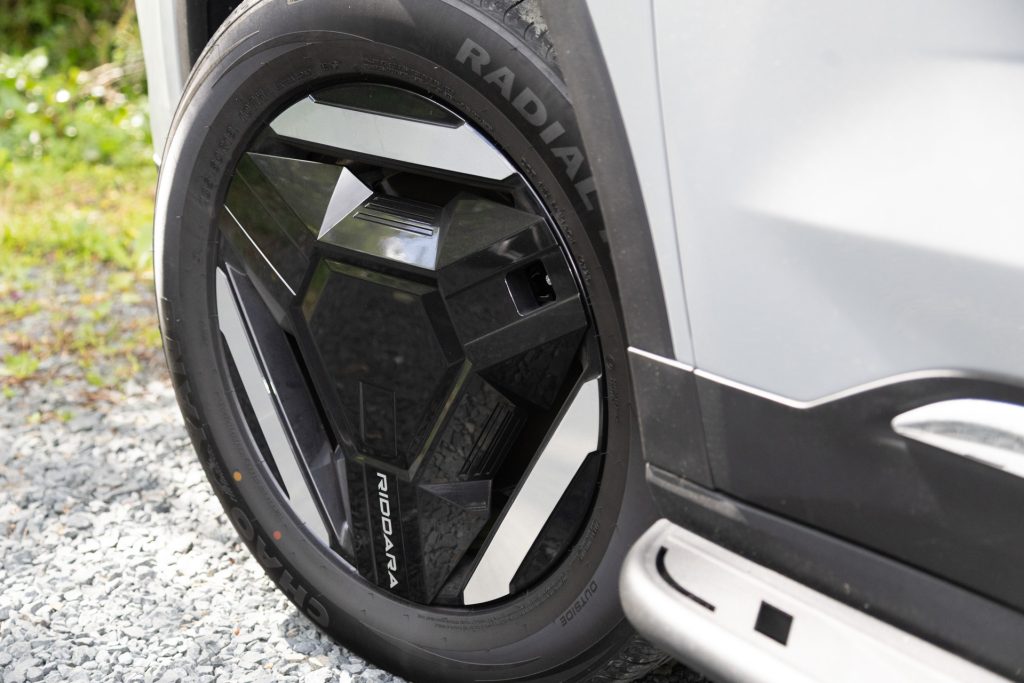 Along the sides are steel side-steps, roof rails, and 18-inch tri-spoke alloys shod with 235/60R18 tyres. They’re wrapped in Chao Yang rubber, a mid-range Chinese brand which proved surprisingly capable on tarmac. A CCS port hides behind the left-rear flap for 11kW AC and 110kW DC charging, good for a 30–80 per cent top-up in around half an hour.