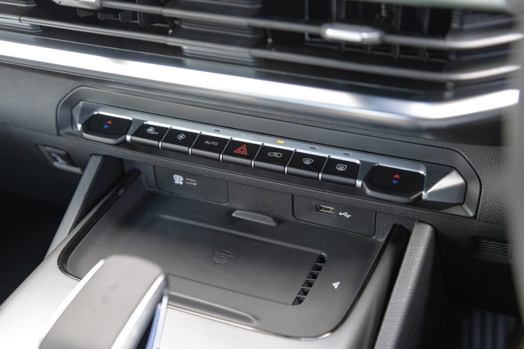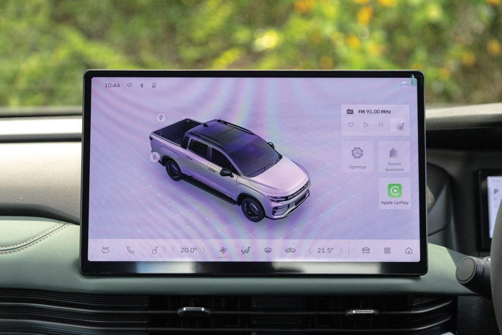 Slide into the cabin and you’ll swear you’re in a modern SUV. Soft-touch dash materials, a 14.6-inch central touchscreen, 10.2-inch digital cluster, and generous storage make it feel properly premium, though I have some concerns over how all this soft touch trim will stand up to a worksite. Ventilated and heated seats front and rear come standard, as does dual-zone climate control with a heat pump and CN95 air filtering. A 50-watt wireless charger and multiple USB-C ports keep devices humming. Physical buttons remain for key climate functions, thankfully spared from deep screen menus.
