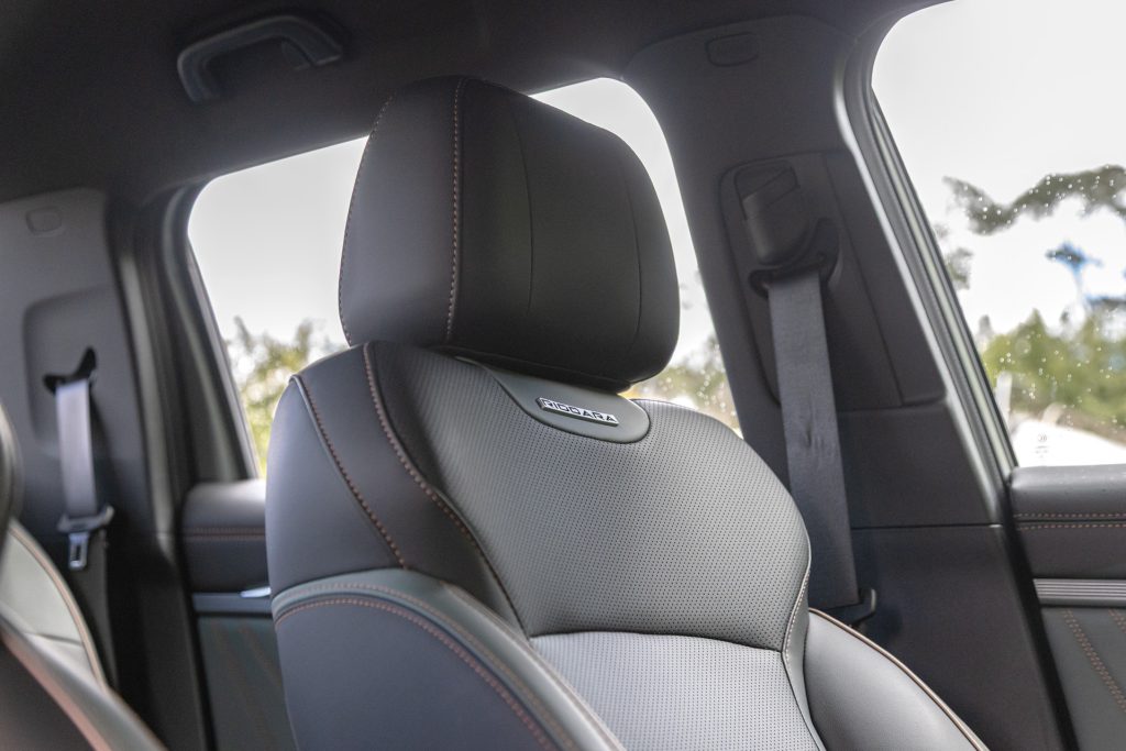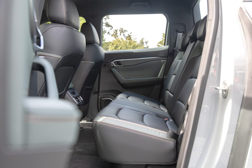 Rear-seat space is outstanding. Because there’s no separate chassis eating into the floor height, legroom rivals a Hilux or Ranger crew cab while the cushion sits higher for better thigh support. Hidden bins under the seat base add another 48 litres of stowage. Two ISOFIX points are fitted, though only two top tethers mean you can’t secure three child seats. A dedicated camping mode keeps air con and power running overnight without draining systems. It will even close the windows automatically when rain is detected, a tiny but telling sign of its tech depth.