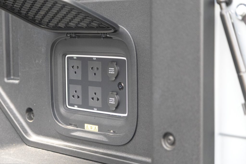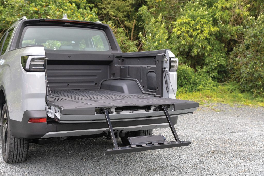 The deck holds 1194 litres and measures 1525 × 1450 mm between the walls, so pallets fit easily. The tailgate is soft-damped and conceals a pull-out step, a clever touch that makes climbing aboard easier (though it was initially jammed on our test unit). There’s also a weather-sealed Vehicle-to-Load power panel with four 240V / 16A sockets plus two 12V ports, allowing tradies to run tools or campers to plug in fridges, lights, even an espresso machine. With up to 6kW of output, few rivals match that level of onboard power.