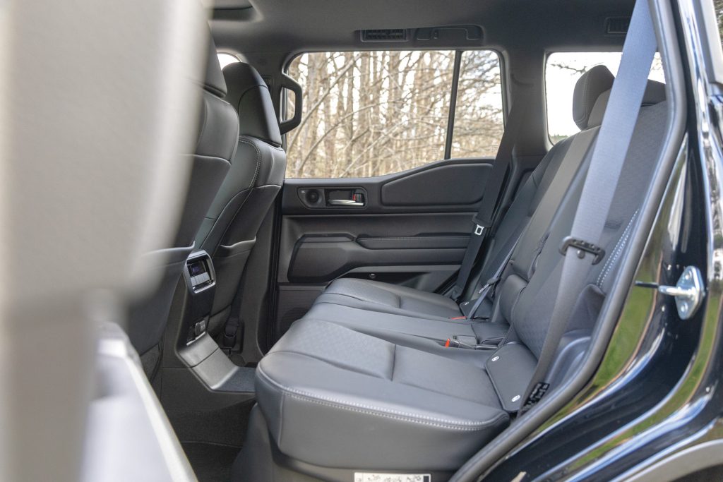 Stepping up into this, taller folk won’t need the running boards but some will. There’s not a huge amount of cabin space, especially legroom, in this despite it being nearly 5m long and 2m wide. But perhaps the most jarring aspect of the interior is the hump that extends above the hybrid battery pack in the luggage area. It adds the best part of 15cm to the floor height and means there’s only 441L of space back there. The elevated floor level makes it more difficult to load heavy items. Still there’s a fair amount of depth, the golf clubs going in any which way. And the second row seats not only have a fold-down function for the back rests but also a roll over capability. That’s to allow access to the third-row pews in the seven-seat versions. We wouldn’t go there though because there’s then even less luggage space left over than in the five seater.