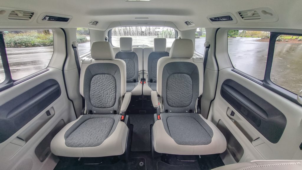 To the seating then. The usual set-up of the NWB is a three-across bench in the back, and masses of cargo space in behind (over 1100L). There is a $2400 option to have a six-seat layout, as seen here, with two separate chairs in the middle and a two-person bench in behind. This gives the four passengers in the rear ample room with easy movement around the cabin too. The middle pews can slide and recline for added comfort. Everyone has their space, everyone is happy.