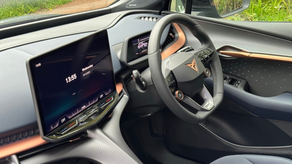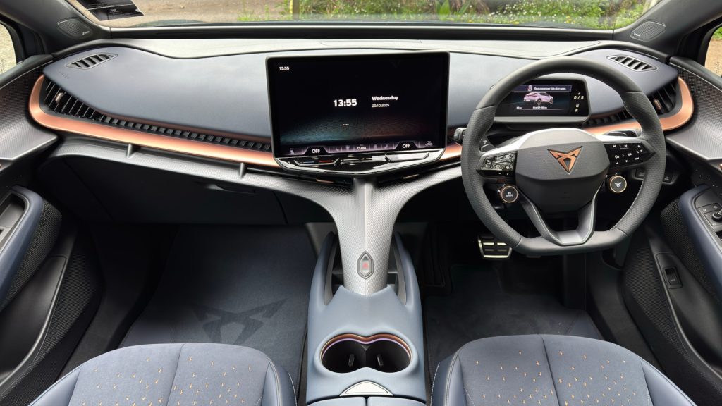 Settling into the driver’s seat reveals what Cupra means by driver-first design. The seating position is low and supportive, visibility is good, and that sculpted spine subtly separates driver and passenger. The 12-way electric seats are superb: heated, memory-equipped, and shaped to hold you through corners without feeling confining.