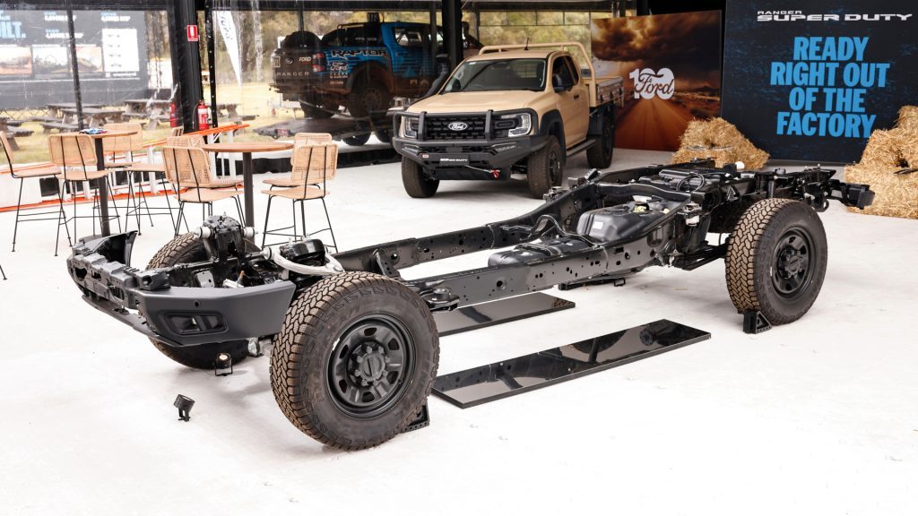 Starting at the bottom, only six per cent of the frame from a standard Ranger has been carried over to the Super Duty. It uses thicker gauge steel, has more reinforcement points, and the front steel bumper has been integrated into the chassis.
