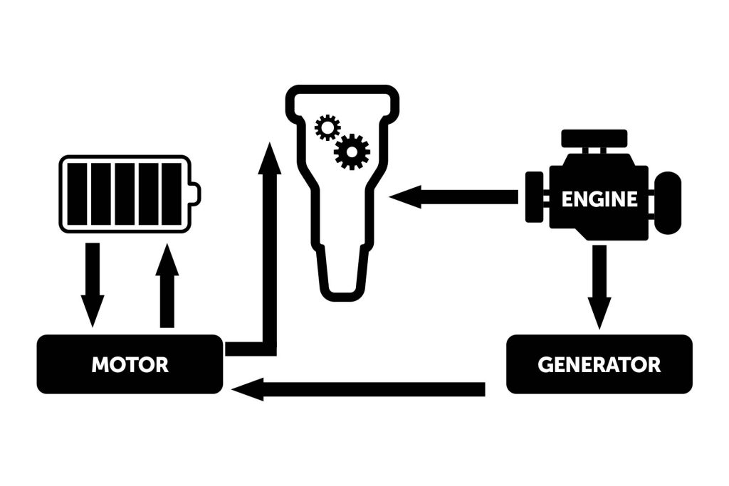 A series hybrid uses the electric motor alone to drive the vehicle, while the engine is used to turn a generator, making electricity to recharge the battery. A parallel hybrid uses the engine to primarily drive the vehicle with the motor assisting, whereas a series-parallel blends aspects of both.