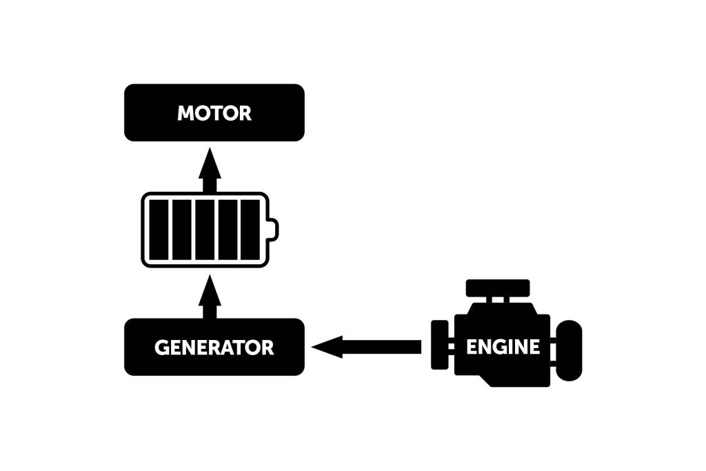 A series hybrid uses the electric motor alone to drive the vehicle, while the engine is used to turn a generator, making electricity to recharge the battery. A parallel hybrid uses the engine to primarily drive the vehicle with the motor assisting, whereas a series-parallel blends aspects of both.