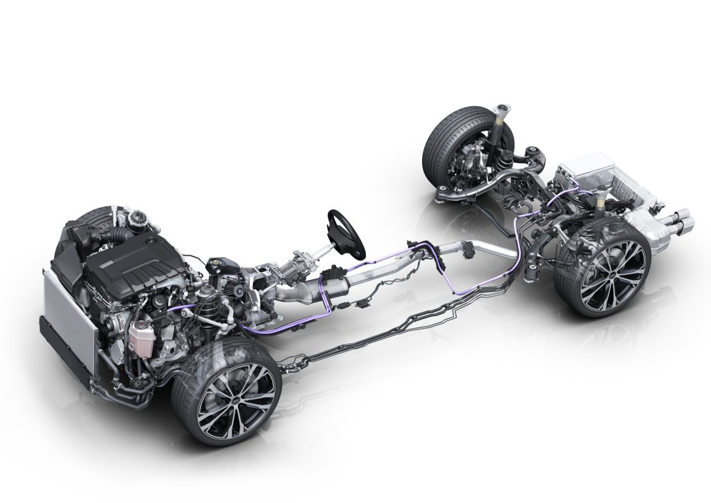 A mild hybrid combines an internal combustion engine (ICE) with a small electric motor and battery. Generally speaking, it involves a 48v electrical architecture, which delivers an increased electrical output without requiring expensive isolation and cabling upgrades. This makes it a more cost-effective hybrid solution, while helping to reduce fuel consumption and emissions by around 5 – 10 per cent. Most mild hybrids use an electric generator (usually called a belt-integrated starter generator or ISG) which replaces the starter motor and alternator. The 48v system can also be used to power components previously driven by the engine. These ISGs can add torque to the engine at lower speeds via a belt driving the crank. It’s not usually sufficient to power the car alone but newer, more powerful systems can achieve some minimal electric motivation. The beefier electrical system can sustain longer engine-off periods when the idle/stop system kicks in, and enable smoother, more instantaneous restarts. Some also enable the engine to shut down when coasting. On over-run and during braking, the ISG acts as a generator to recharge the small 48v battery. Many European models now run mild hybrid set-ups, while some use the 48v system to run electric turbos.