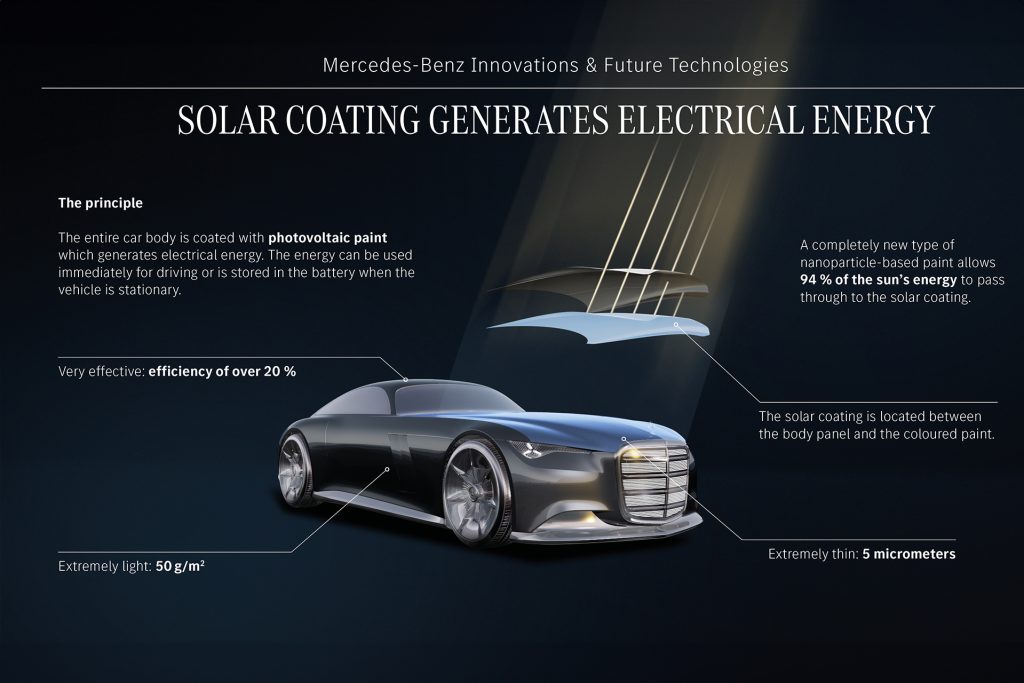 One of the Vision Iconic’s most intriguing innovations is its solar paint. It has a photovoltaic coating applied like a wafer-thin layer across the body. Mercedes says the system could capture solar energy across up to 11 square metres of surface, generating enough power for up to 12,000km of driving per year under ideal conditions. The recyclable coating contains no rare earths or silicon and operates even when the car is stationary.