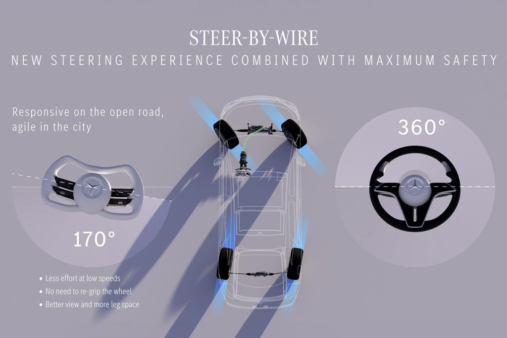 The Vision Iconic also introduces steer-by-wire technology to the brand’s conceptual portfolio. By removing the mechanical link between the steering wheel and front wheels, the system offers smoother, more precise control, particularly when paired with rear-axle steering. It also allows for greater design flexibility and easier manoeuvring; no more hand-over-hand steering in tight spaces.