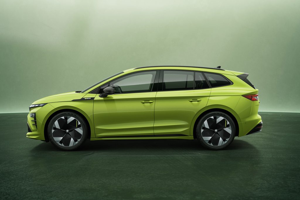 The Enyaq RS takes things further with a sport chassis lowered by 15 mm (front) and 10 mm (rear), progressive steering, stronger front brakes and exclusive RS design cues including black lettering, unique bumpers and 21-inch Vision wheels in anthracite. Two EV sound profiles—Sport and Futuristic—are selectable through drive modes.