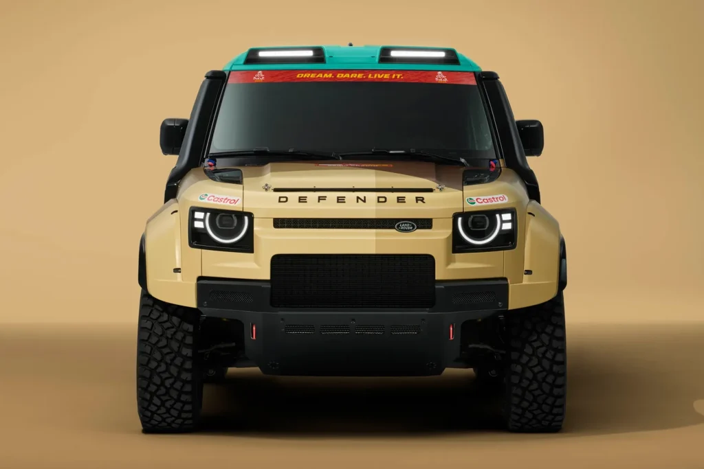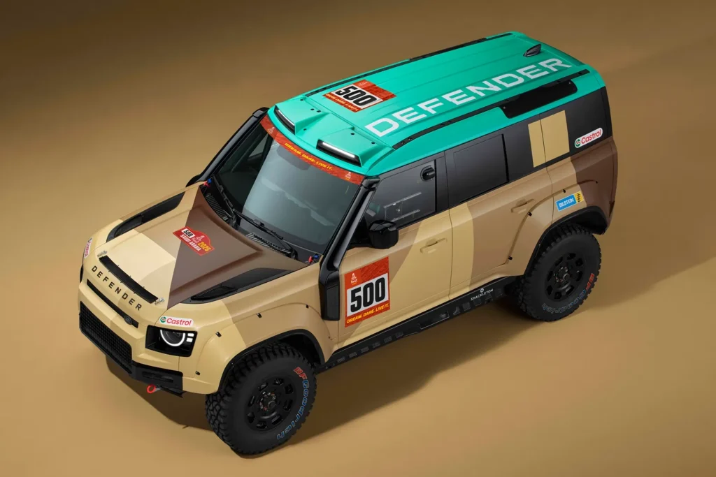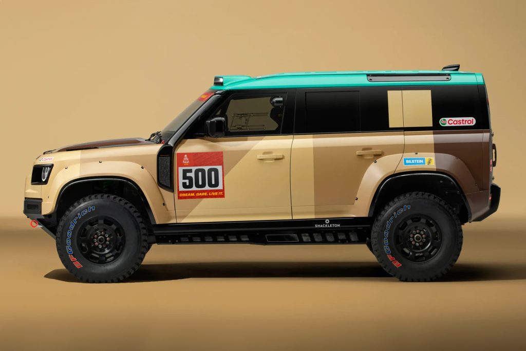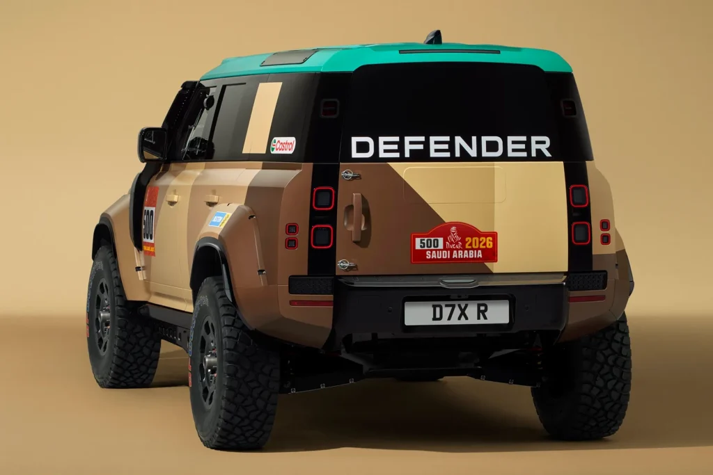 The rally-prepped Defender wears a striking new Geopalette livery, blending sand, stone and earth tones with a contrasting aqua roof. The design is expected to become the visual signature of Land Rover’s modern rally-raid programme.