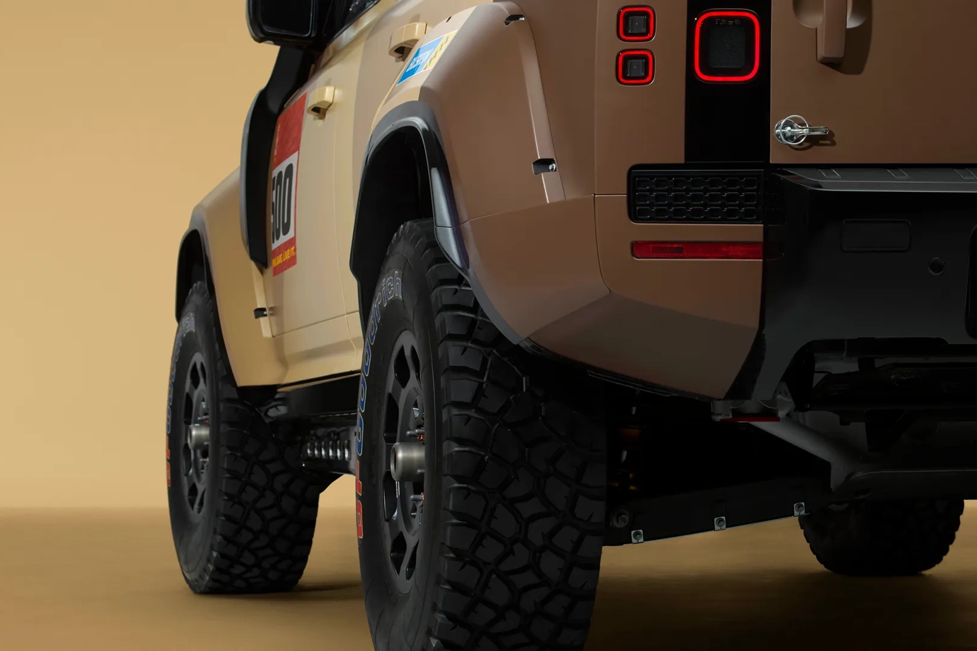 The wider stance and taller suspension are complemented by extended wheel arches, reprofiled bodywork to increase approach and departure angles, and extensive underbody armour.