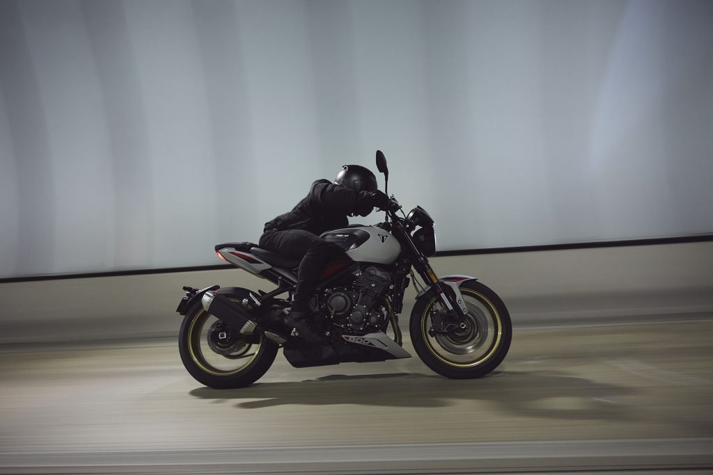 Triumph says the triple’s unique setup, featuring triple throttle bodies, a forged crank, and high-compression pistons, gives the bike addictive real-world performance that’s both refined and visceral. Sound is a big part of the Trident experience too, with the airbox and intake system tuned for a deep induction roar, feeding into an upswept sports silencer that delivers the Triumph triple soundtrack.